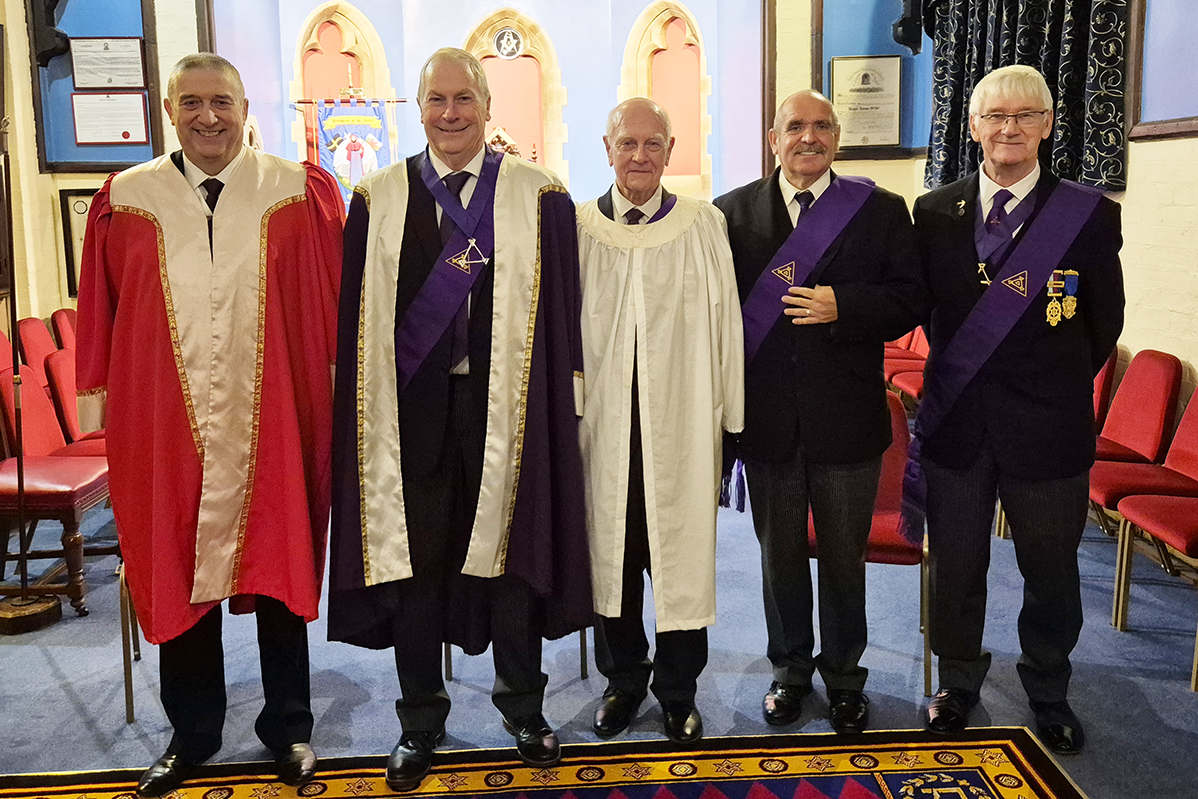 The Illustrious Preceptor, Andy Whittle, who just happens to be the Second Provincial Grand Principal in The West Lancashire Royal Arch Chapter, entered the Conclave with a confident stride ably assisted by a crutch! Only three weeks earlier Andy had undergone a knee replacement, and he wasn’t going to let something like that stop him discharging his duties.