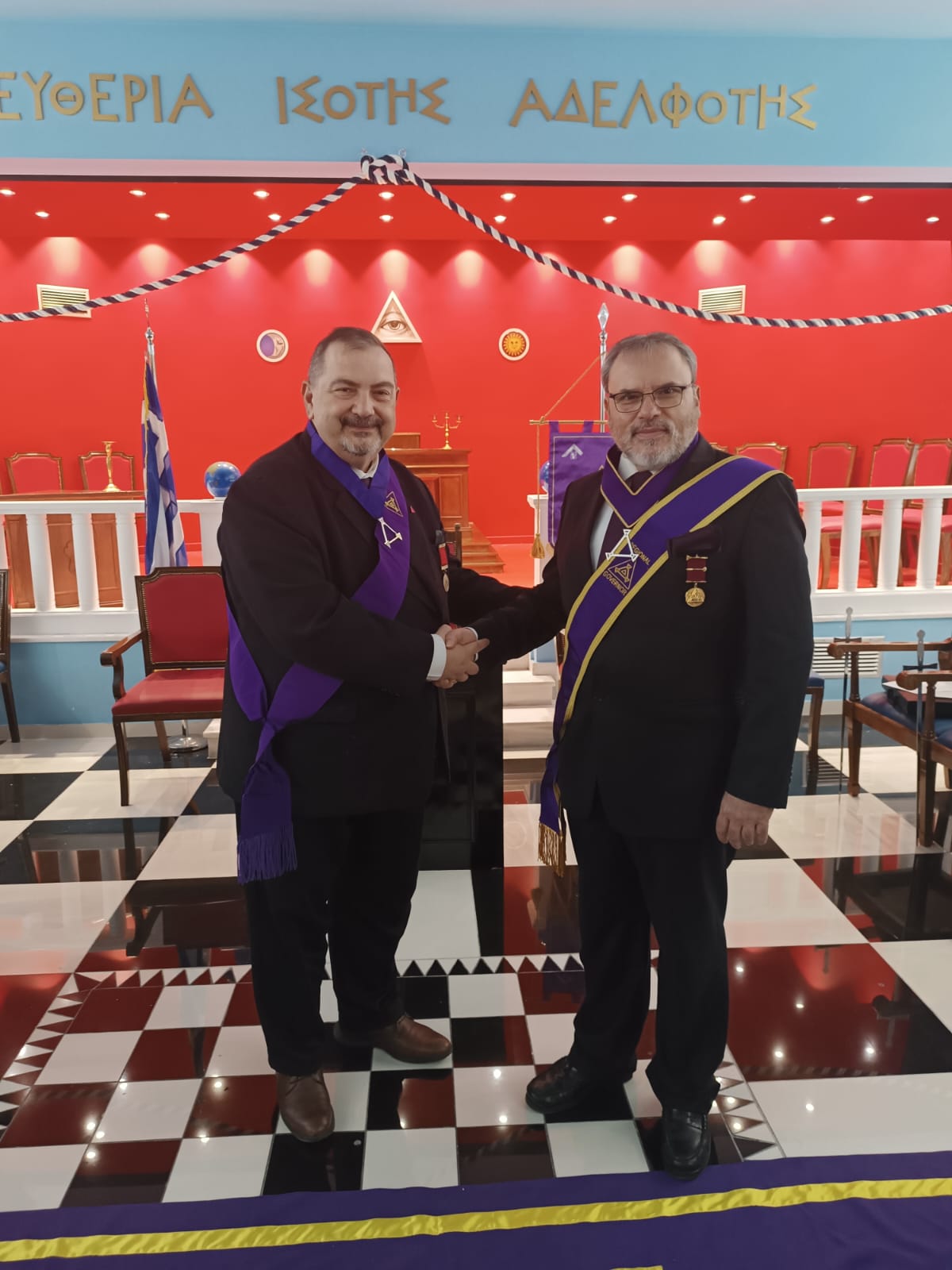 The newly installed Illustrious Preceptor, Ill. Bro. K. Athanasopoulos, with the Regional Governor of the Mediterranean Region, R. Ill. Bro. E. Kalogeropoulos