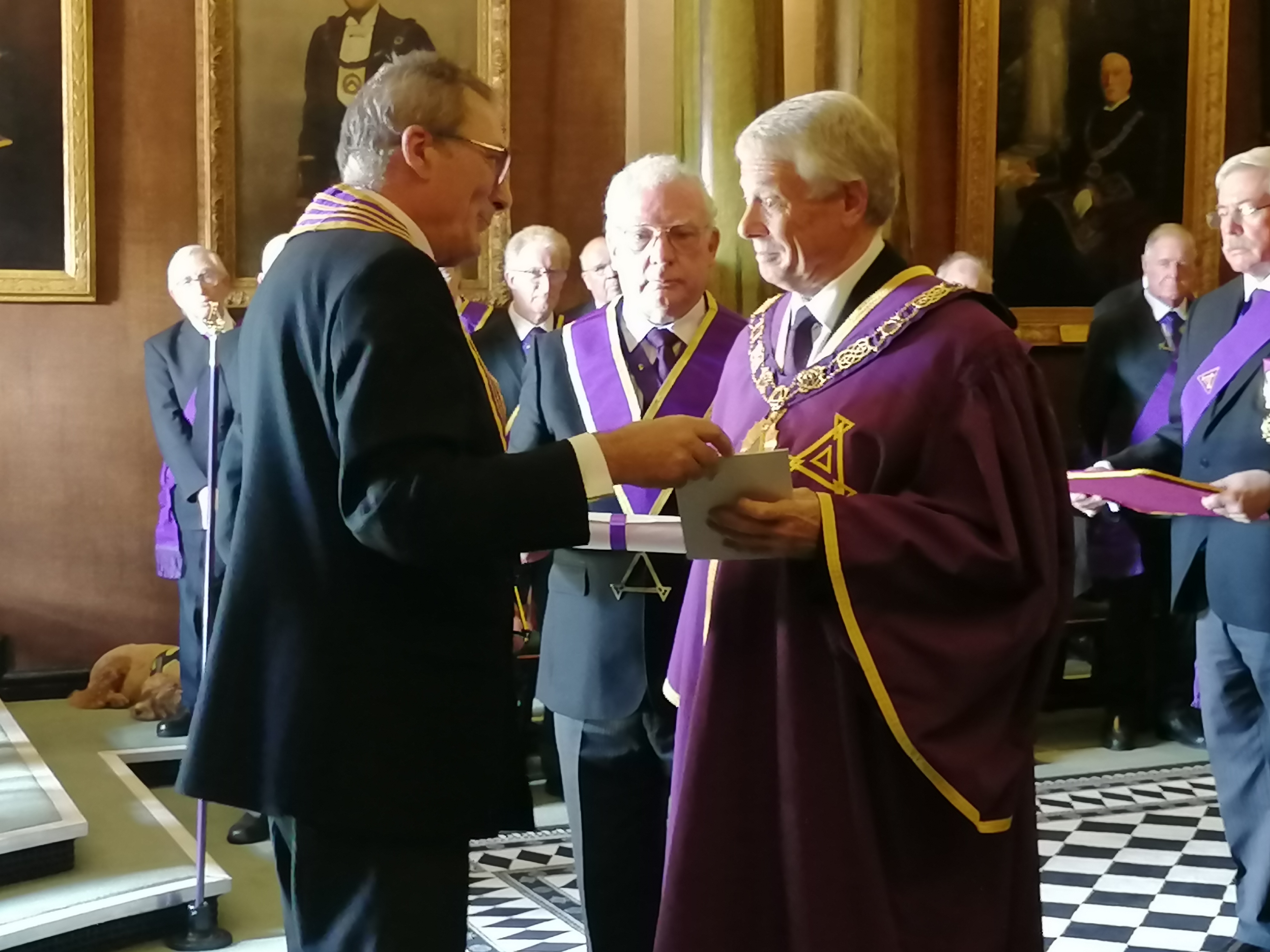 Our Grand Master Most Illustrious Brother Jonathan Charles Roberts presenting Ill Preceptor Ill Bro Doug Black with the Warrant.